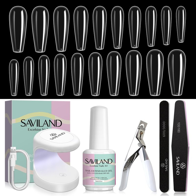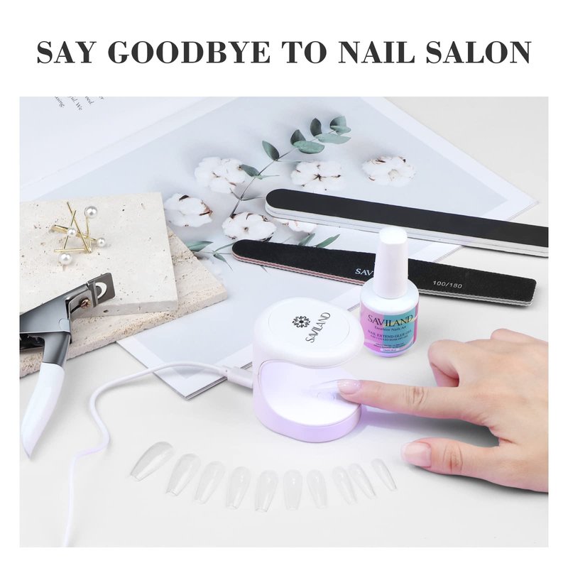 - SAVILAND GEL X NAIL KIT: SAVILAND all-in-1 gel nail kit contains 1*15 ml nail glue gel, 500 pcs coffin nail tips,1* mini U V/LED lamp,2*nail file and 1*nail clipper, to meet your multiple needs, saving you much time and money going to the nail salon
