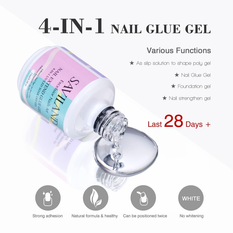- FOUR FUNCTIONS IN 1 NAIL GLUE: The 4-in-1 gel x nail glue is perfect for nail art DIY and salon use. The glue gel on nails can be used as nail glue, as base coat, as slip solution, to stick diamonds. And with its excellent adhesion, to ensure the nail tips and decorations will not move, not easy to fall off, let your nail design will maintain a charming effect on your nail surface for 3-4 weeks