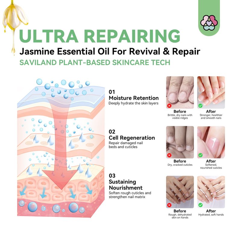 SAVILAND Jasmine Essential Oil for Cuticle Nails Hands: Ultra Repairing Cuticle Oil 100% Pure Plant-Based Nail Strengthener Hand Oil for Dry Hand Damaged Cuticle Weak Nail Care with Travel Bottle Home