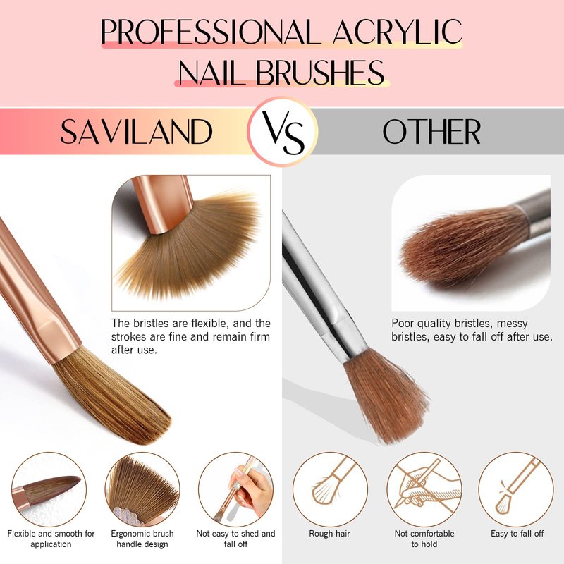 - Professional Acrylic Nail Brush Set: Saviland acrylic nail brush set is well-equipped with 7PCS brushes for acrylic nails. These acrylic nail brushes offer good flexibility and acrylic powder-carrying, making them suitable for acrylic powder application