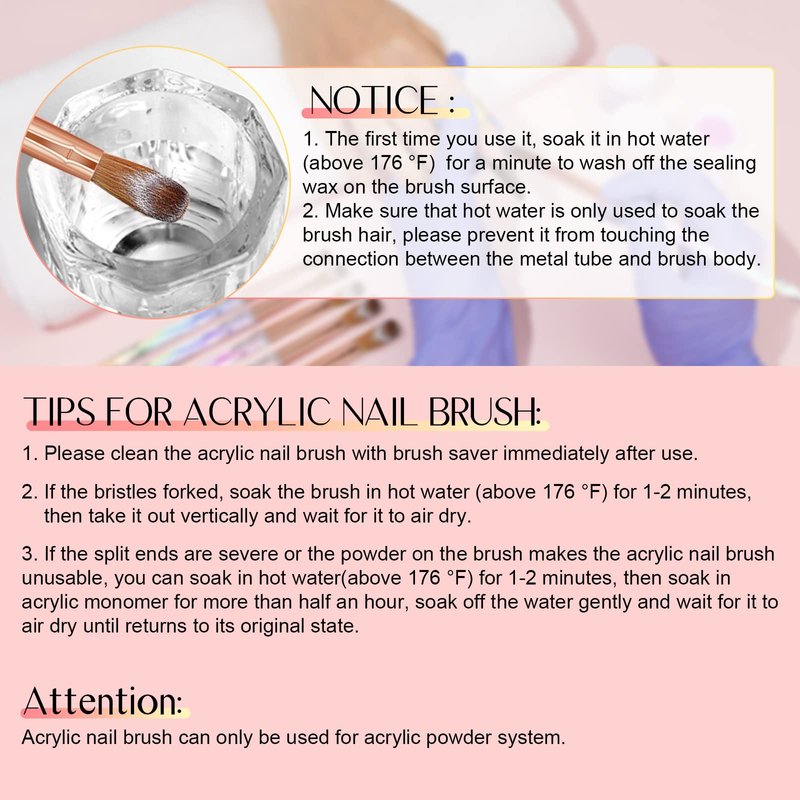 - Warm Tips: Before the first use, soak the nail brush in warm water for a minute to remove surface wax. After each use, clear acrylic clumps from the bristles with a cotton pad. Instantly soak the acrylic brush in acrylic liquid to clean and prevent caking