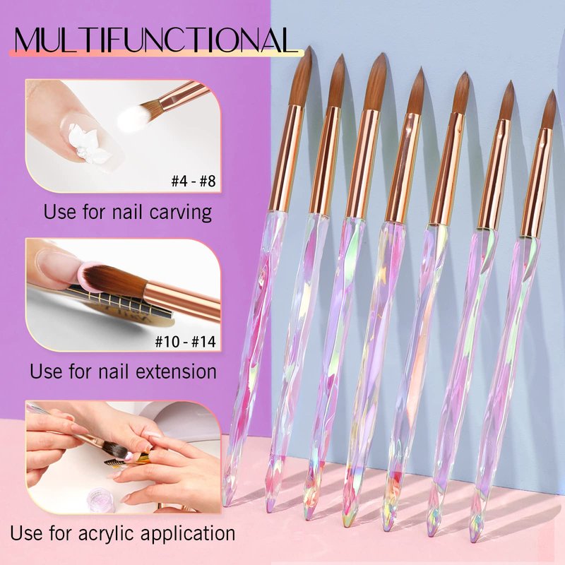 - Versatile Nail Brushes Set: This nail acrylic brush set includes 7 sizes, ideal for various acrylic powder applications. size 4/6/8 acrylic brushes are for 3d nail carving while size 10/12/14/16 acrylic brushes are for nail art extension and nail gradient