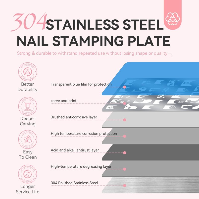 - Nail Stamper Plate: The nail art stamping plates are made from stainless steel, with 304 stainless steel material, the nail art tool is corrosion-resistant that can withstand repeated use without losing its shape, quality or finish