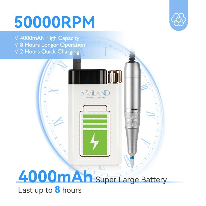 - ✨【Professional 50000RPM Nail Drill Set】Saviland portable electric nail drill set comes with a nail drill machine and a nail drill pen, up to 50000RPM. A must-have nail drill for professional nail salons, providing better service to your clients. Also, perfect for nail art lovers or nail starters DIY nails at home.