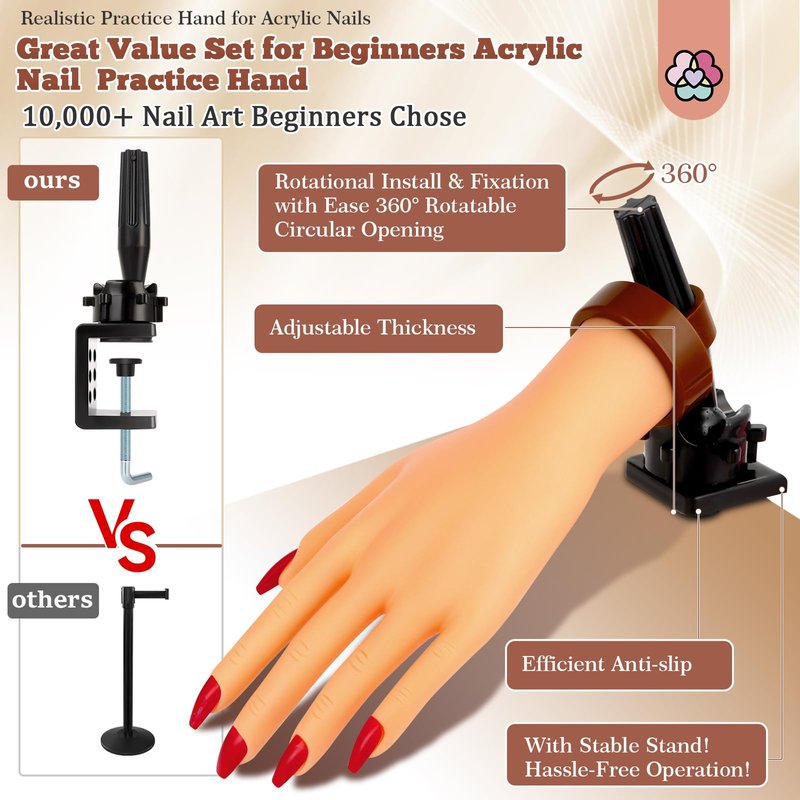 1. Complete Tools for Nail Hand Practice: It includes a nail mannequin practice hand, base, 120 acrylic nail tips, and 10ml/0.34fl.oz. nail glue. 2. Nail Mannequin Practice Hand: Realistic and flexible high-quality soft rubber silicone practice hand, safe and environmentally friendly, no odor. Internal aluminum tube design allows the fingers easy bending into desired positions, enabling practice of various nail techniques effortlessly. 3. Base: The sturdy base is easy to assemble and can be adjusted at will to meet the needs of desktops of different thicknesses. It is easy to disassemble. It provides stability for the practice hand during use, ensuring a comfortable and controlled practice experience. 4. 120 Acrylic Nail Tips & 10ml Nail Glue: 24 different sizes of acrylic nail tips and quick-drying glue can meet at least 120 practices, allowing you to try various nail lengths and shapes. 5. 360° Rotating Practice Hand: The circle mouth can rotate 360 degrees to meet different angles, say goodbye to restrictions, and enjoy the freedom of unlimited nail customization. 6. Master Acrylic Nail Techniques with Convenience and Creativity: With this convenient kit, you can perfect your nail art skills and unleash your creativity at home, focusing on mastering acrylic nail technology. 7. Gifts For Enthusiasts: Ideal gift choice for nail art enthusiasts or aspiring artists.