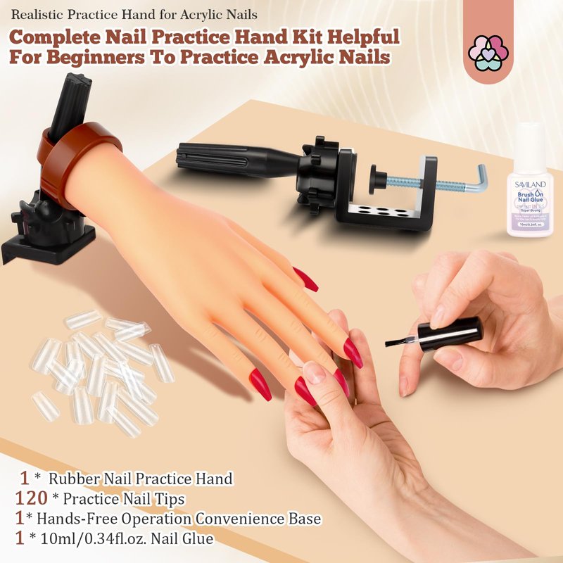 - Master Acrylic Nails Skills with Nail Hand Practice Kit: SAVILAND Practice Hand Nail art kit contains 1 silicone nail practice hand, 120 medium square nail tips, 1 x 10ml/0.34fl.oz. quick-drying nail glue, 1 x adjustable base, perfect for beginners and acrylic nail lovers to practice acrylic nails multiple times. With this kit, you can confidently practice and perfect your nail art skills