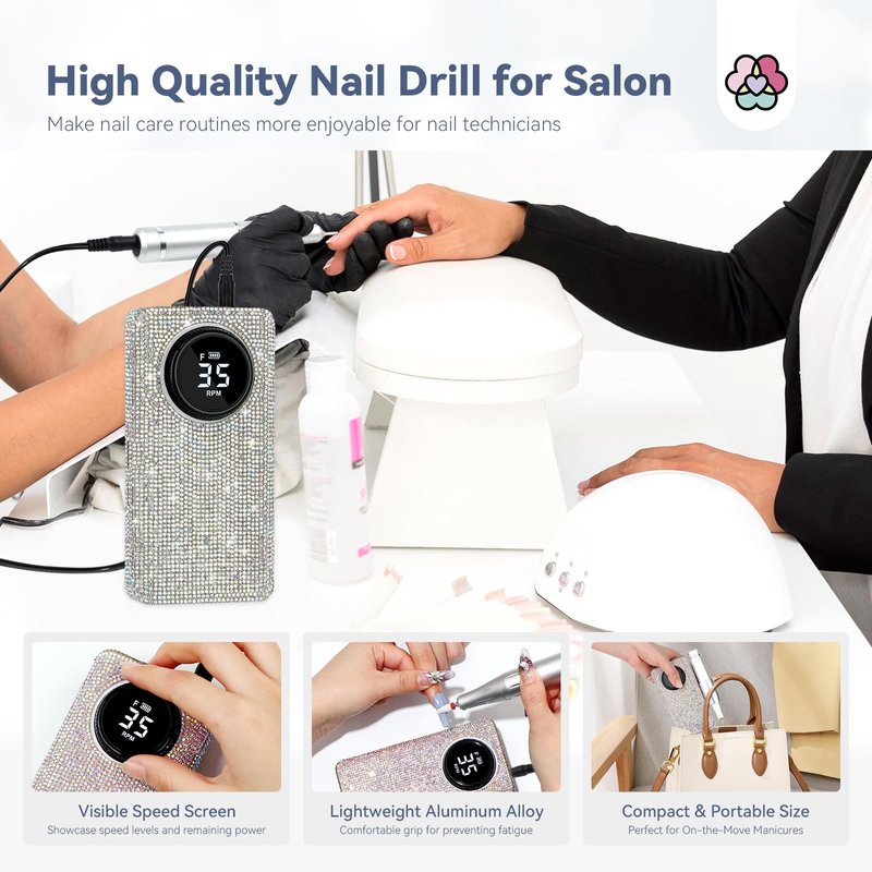 - Diamond-Shiny Look & Complimentary Rhinestones: The rhinestone-attached nail drill is a bright and eye-catching tool. It is not only perfect for personal use but also makes an excellent gift for nail enthusiasts. It comes with a set of rhinestones that can be used to decorate either the drill itself or your nails.