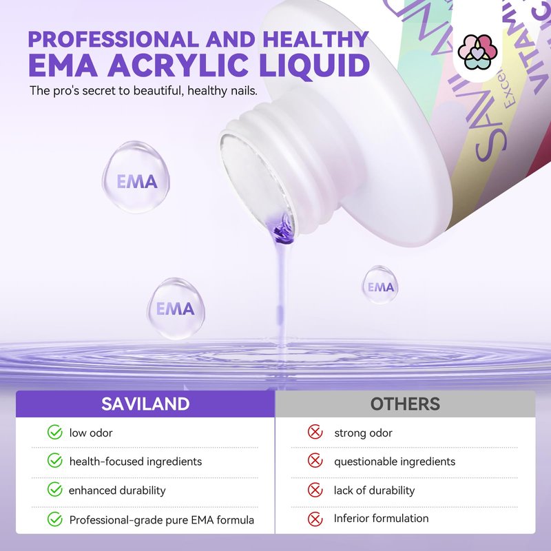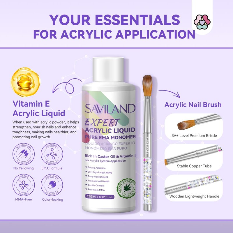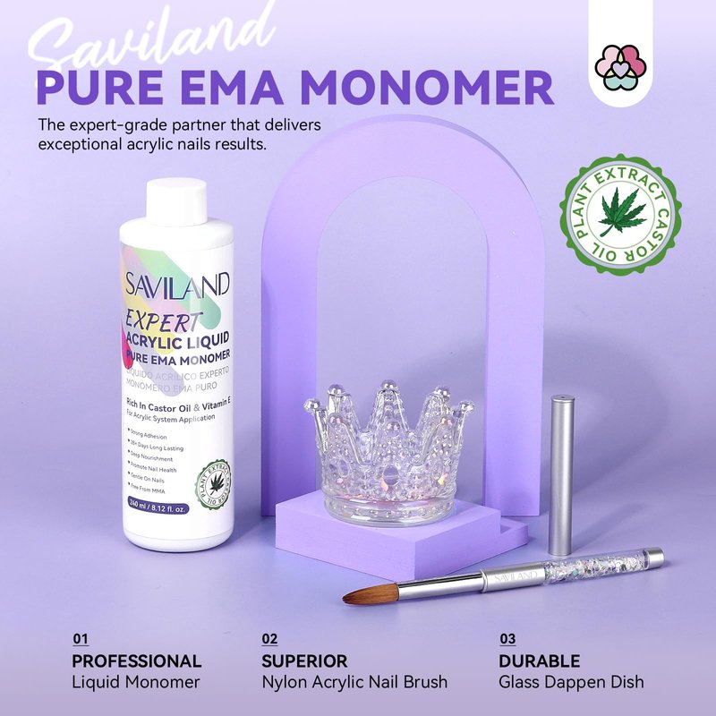 - 💧【Professional Acrylic Liquid Monomer Kit】The Saviland acrylic nail liquid & brushes set with dappen dish is an essential tool for acrylic applications, specifically tailored for various acrylic powder techniques. Formulated with EMA formula and optimized for professional use, it lays the foundation for impeccable acrylic application. Ideal for newcomers venturing into creating stunning acrylic liquid nails using acrylic powder.