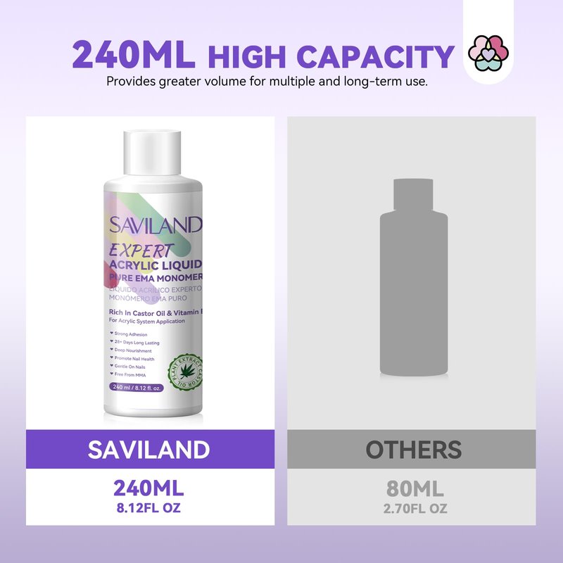 - 💧【8.12fl.oz Ample Capacity, Versatile Functionality】Crafted with a generous 8.12fl.oz capacity, Saviland's acrylic nail liquid caters not only to professional nail salons but also to acrylic nail aficionados. With this acrylic liquid designed for acrylic powder, users can freely engage in various acrylic applications like nail extension, carving, repair, reinforcement, and French nails, utilizing existing acrylic powder stocks.