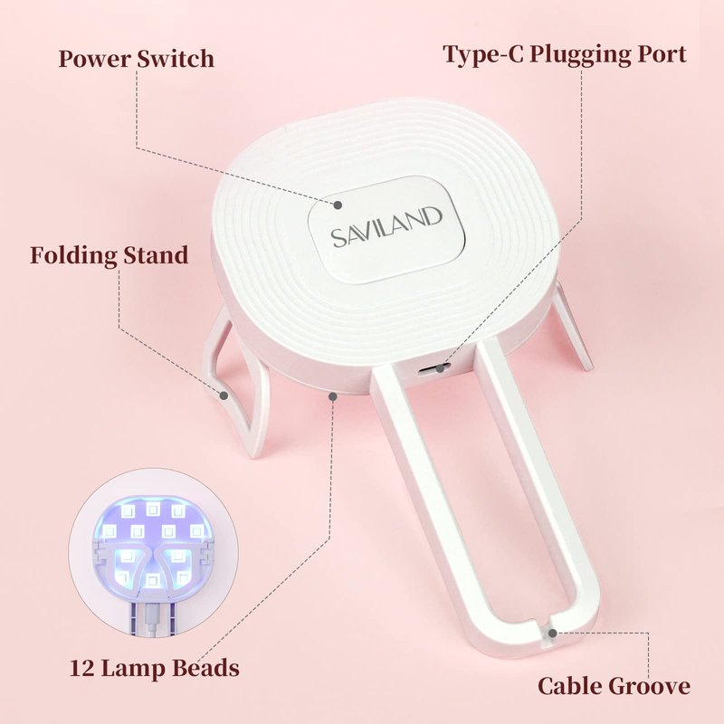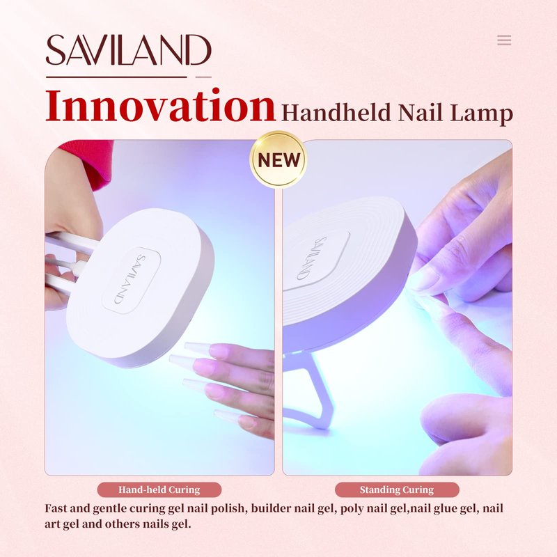 - š ćINNOVATIVE FOLD STAND NAIL LAMP ćSaviland handheld nail lamps adopts a multi-functional folding design, which can be folded for handheld use, or can be opened and placed on the desktop, which is considerate and convenient. This U V light is a portable nail dryer that combines an open design and a hand-held design, especially suitable for sticking nail tips and nail art decoration for manicure design. Better design, bring you a better manicure experience.