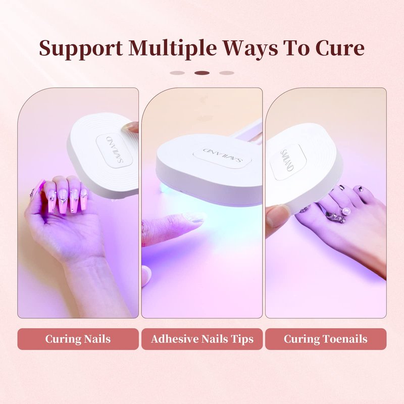 - š ćPORTABLE & EASY TO USE ćSaviland U V light for nails are not only small and lightweight, but they also work great. Nail U V light is a bit larger than a smartphone and can easily fit in a carry-on bag. One key control, The default timing of the U V LED nail lamp is 60s, and it will automatically turn off after 60s. Press it again to turn it off. Let you complete your nail art creation simply and easily.