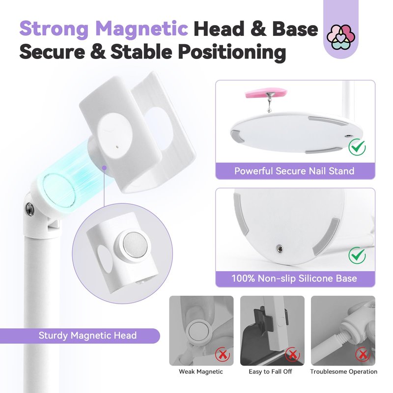1. 360° Adjustable Magnetic Rotation: Effortlessly adjust the angle of the UV light for optimal coverage and precision during curing, ensuring no dead ends or missed spots on your nails. 2. Secure and Stable Positioning: The strong magnetic head and base provide a secure grip, keeping the UV Nail Lamp Stand stable and preventing any accidental movement while working on your nails. 3. Convenient Magnet Nail Tray Attachment: The magnetic suction base allows for easy attachment of a magnet nail tray, providing a handy storage solution for your nail tools and accessories, keeping them organized and within reach. 4. Portable and Travel-Friendly: With its detachable design, the UV Nail Lamp Stand can be disassembled into a compact size, making it ideal for travel or on-the-go manicures, allowing you to maintain your nail care routine wherever you are. 5. Efficient Handsfree Operation: Enjoy the convenience of handsfree operation with the handheld UV light that cures gel nails without the need to hold the light source, freeing up your hands for multitasking or relaxation during the curing process. 6. Professional-Quality Results: Achieve salon-like results at home with the UV Nail Lamp Stand, thanks to its precise curing capabilities and even distribution of UV light, ensuring a flawless and long-lasting manicure.