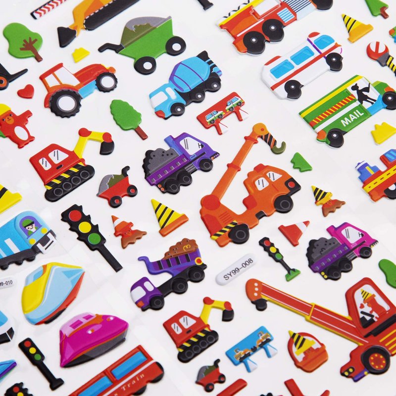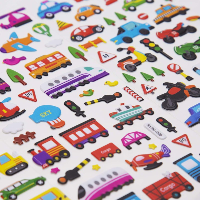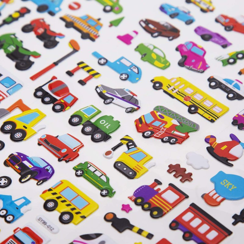 - VALUE PACK OF STICKERS FOR KIDS: Total of 12 sheets with 6 different stickers(2 Sheets for Each Style ), more than 400 pieces stickers to makes for hours of creative activity fun! Such as cars, trains, airplanes, fire trucks, helicopters, motorbikes, school buses, spaceships and more various stickers.