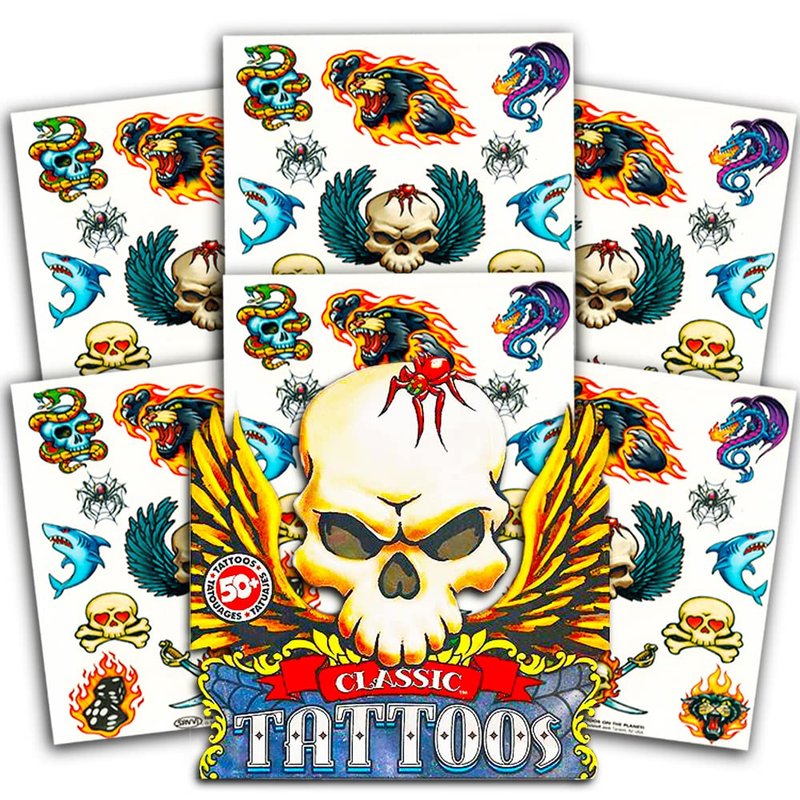 American Traditional Temporary Tattoos Pack -- 50 Bright and Bold Classic Tattoos (No Duplicates). Featuring iconic American Traditional tattoo designs including ships, snakes, roses, skulls, daggers and more! American Traditional tattoo pack contains a total of 50 large temporary tattoos on multiple sheets. Perfect to hand out or apply at costume parties. Perfect for temporary tattoo party supplies, party favors, motivational awards and more! Temporary tattoos for kids and adults alike. Colorful American Traditional temporary tattoos featuring classic designs! The perfect accessory for dress up parties and Halloween costumes! Great as biker temporary tattoos and rock star temporary tattoos. MADE IN THE USA.