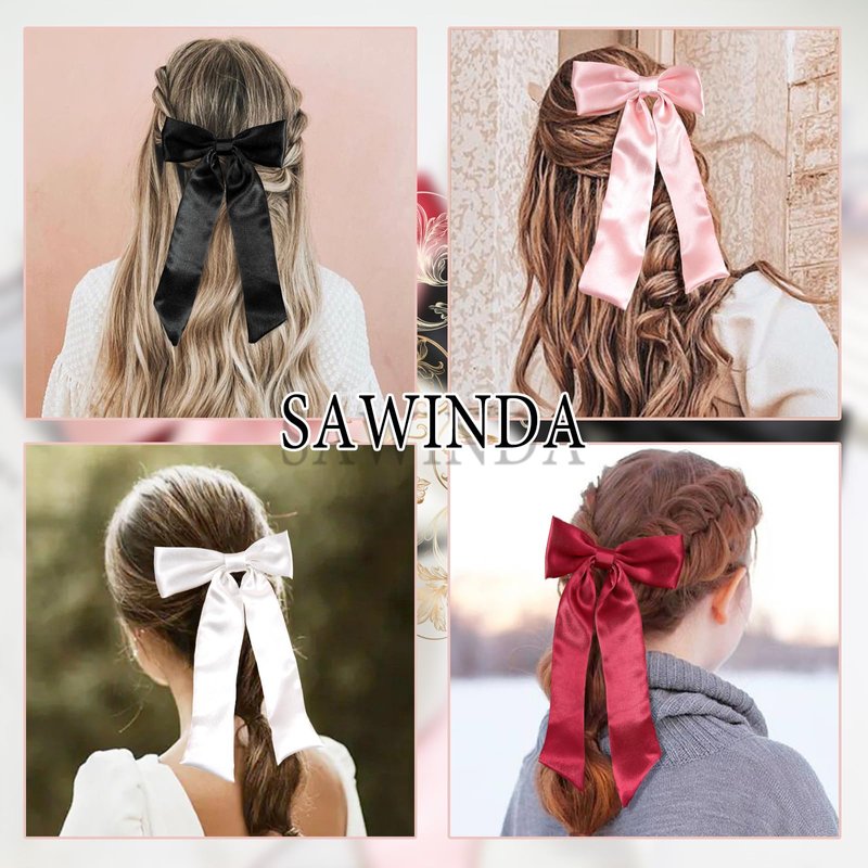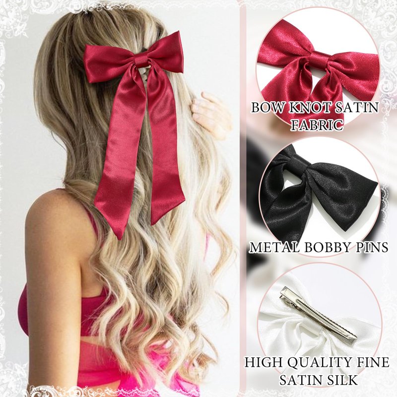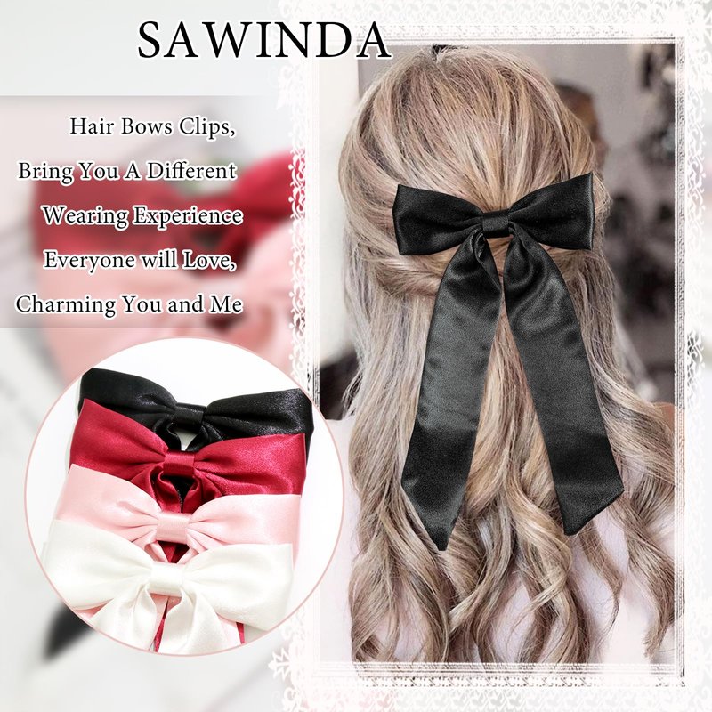 SAWINDA 4PCS Satin Hair Bows for Girls Bowknot Hair Barrette Ribbon Bows Ponytail Holder Accessories with Oversize Tail Wedding Prom Daily Outfits Hair Bow Accessories for Women (Black&Red&Pink&White)