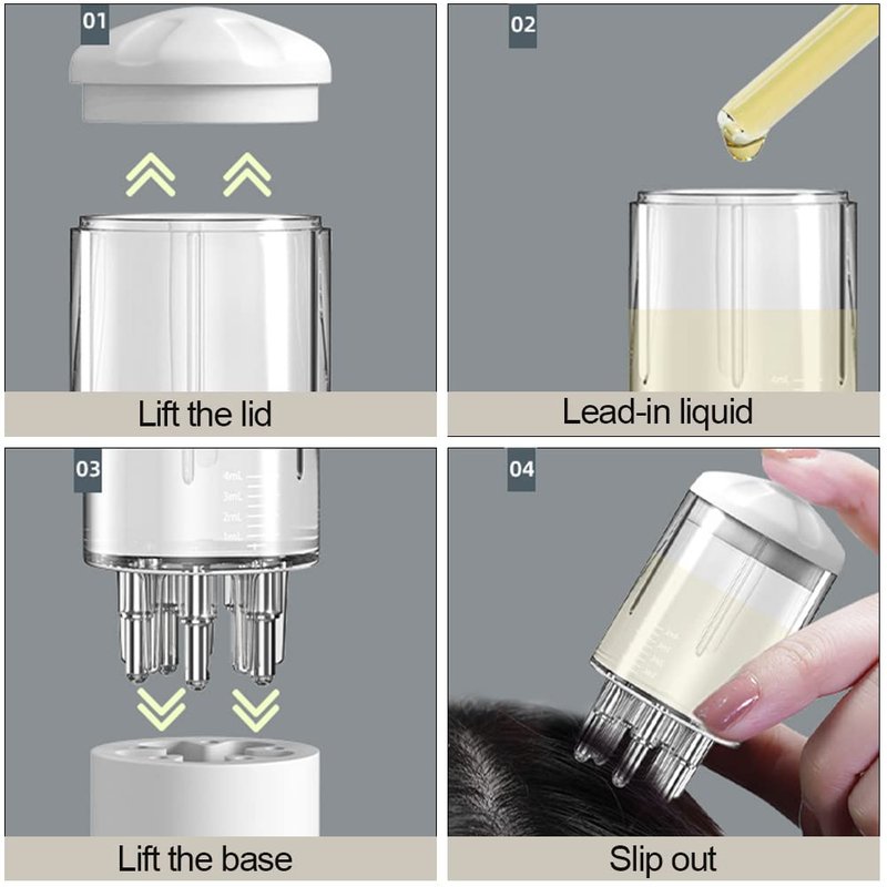 - 【Easy to Use】1 Lift the seal lid directly. 2 Fill the appropriate dosage into the graduated medicine bin. 3 Open the silicone base directly. 4 In the need to apply the place sliding, you can be out of the liquid. What's more, the scalp applicator comb with scale, dosage of medicine at a glance.