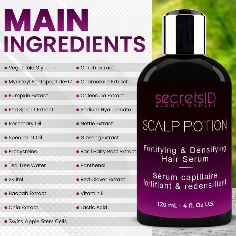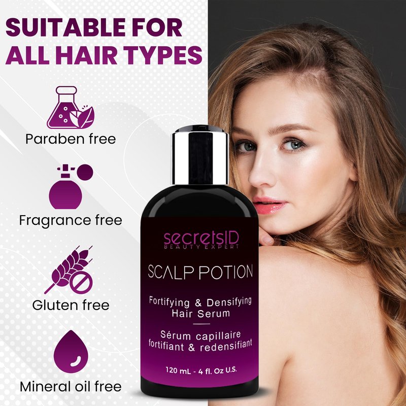 Introducing Scalp Potion, your ultimate solution for fortifying and densifying your hair, crafted with care in America using only the finest quality ingredients. Say goodbye to hair woes and hello to stronger, thicker and longer locks with our powerful hair serum. Designed to promote hair growth and reduce hair loss by prolonging the hair's life cycle, Scalp Potion works wonders to strengthen each strand from the root. But that's not all - our 100% Vegan serum is a multitasking marvel. It soothes and refreshes the scalp, providing relief from irritation while effectively balancing oiliness and reducing dandruff. Our huge 120ml size contains enough product for a complete 3-month treatment. This is the recommended treatment duration for achieving optimal results. Formulated with a unique blend of key ingredients such as Oligopeptide, Baobab Protein, Pumpkin Extract, and Pea Sprout Extract, Scalp Potion goes beyond the surface to nourish and protect your hair. Spearmint, Rosemary and Tea Tree Extracts provide a cooling sensation, while Procysteine and Swiss Apple Stem Cells work together to promote fuller, denser hair. With the added benefits of Hyaluronic Acid for moisture, Ginseng Extract for strength, and Vitamin E for protection against UV damage, our serum delivers comprehensive care for your hair and scalp. Experience the transformation as Scalp Potion strengthens your hair, making it more resilient and healthier from within. Say hello to fuller, longer and denser locks and a happier, healthier scalp with Scalp Potion - the ultimate haircare essential.