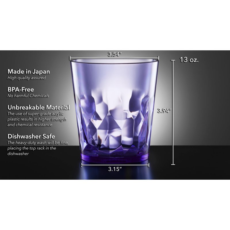 - UNBREAKABLE ELEGANCE (MADE IN JAPAN) – Enjoy worry-free sipping with our stunning, crystal-clear drinking glasses. Designed to mimic real glass, these durable plastic glasses drinking elevate every occasion, indoors or outdoors. 3.54 in (Top) x 3.15 in (Bottom) x 3.94 in (Height), 100% Made in Japan, Super Grade Acrylic Plastic (BPA Free / Prop 65 compliant)