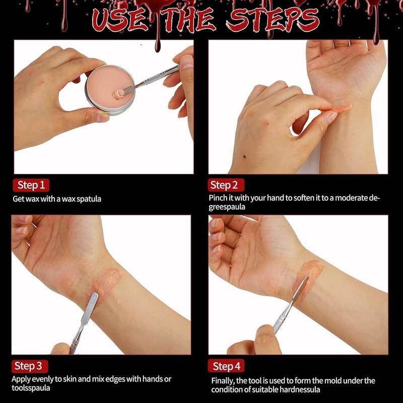 - Easy to DIY FX Makeup & Remove:Apply some spirit gum (not included) to the skin.It will make the wax more sticker to the skin.Scrape the wax out and shape the look you want.Smooth the edges between wax and skin.Use caster sealer (not included) to let the wax more fit to your skin.Apply some special sealant (not included) for skin wax,this step can increase the firmness and the gloss of wax.Add some fake blood to get the effect you want.To remove,peel off,use oil-based makeup remover to wash off.
