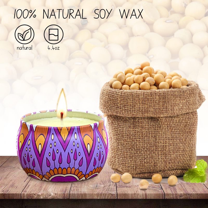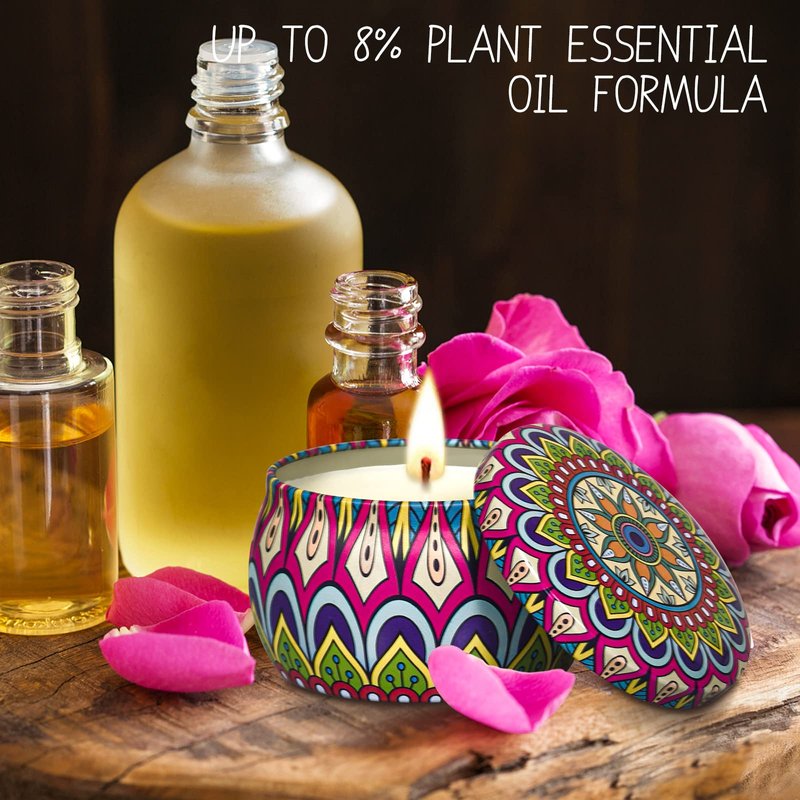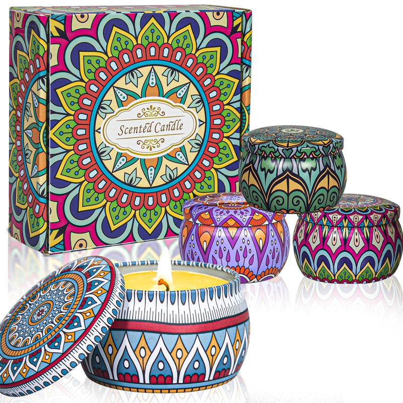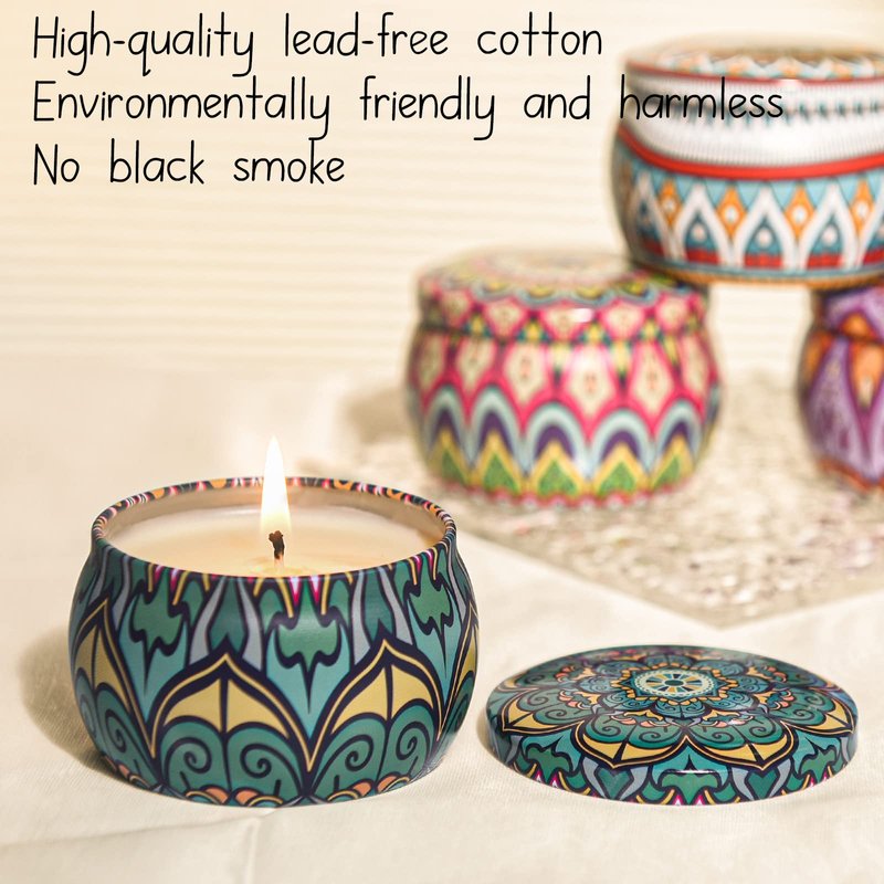 - SCENTED CANDLES GIFT SET FOR WOMEN: 4 Small portable and exquisite travel tin candles come in a gift box, with lead-free cotton wick,100% vegan,be free from any harmful chemicals or additives,low heat and provide a long lasting safe burning,releasing rich fragrance, adding color and character to room, they are the best candles gifts for Christmas,Birthday,Mother's Day,Valentine's Day,and more.