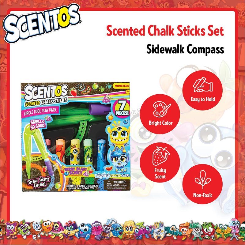 Scentos Chalk Set - 7-Piece Sidewalk Compass Chalk Art Kit for Kids - Assorted Fruity-Scented Sticks with Stencils & Holder - Washable