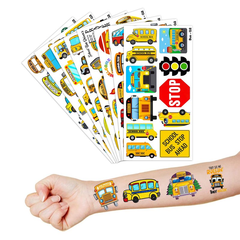 - Cute And Funny School Bus Transportation Back To School Themed Tattoos: School Bus Transportation Back To School Temporary tattoos Stickers, features an assortment of themed characters, colors are bright, and designs are adorable, use them as party favors and your kids will love. Perfect for themed party, birthday activities, school reward and other party events. They will be your kids' favorite small gifts.