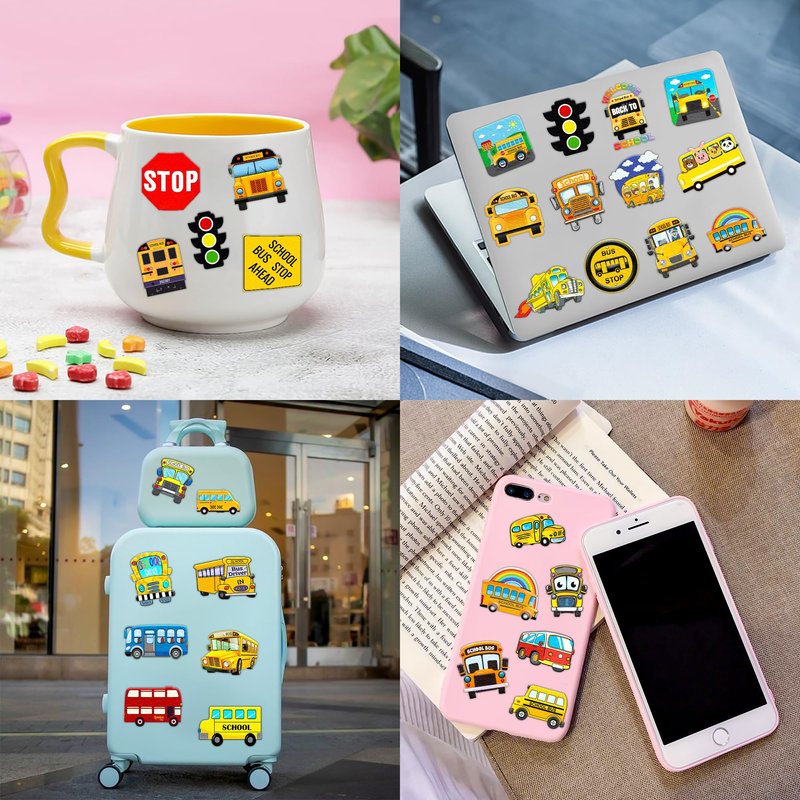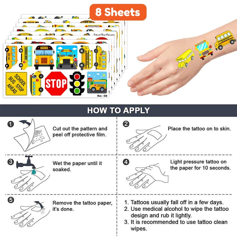 - Fun School Bus Transportation Back To School Birthday Party Decoration: The set contains instructions for use and is easy to use. School Bus Transportation Back To School tattoo stickers can be applied on arms, face, hands, neck, shoulders, legs, wrists and ankles to make you look cool at all kinds of parties. Popular hit with your kids. You can apply them to your body or some smooth objects, for example, glass, stationery, paper, crafts cups, cabinet, bottle.