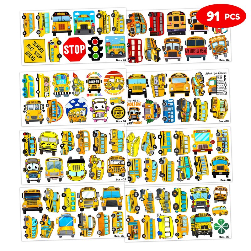- Fun School Bus Transportation Back To School Birthday Party Supplies: 8 Sheets 91 PCS School Bus Transportation Back To School temporary tattoos stickers, Have a variety of cartoon themed characters, Children can easily School Bus stickers and take unique photos to make fond memories. The size of each sheet is 6.1 * 3.1 inches.