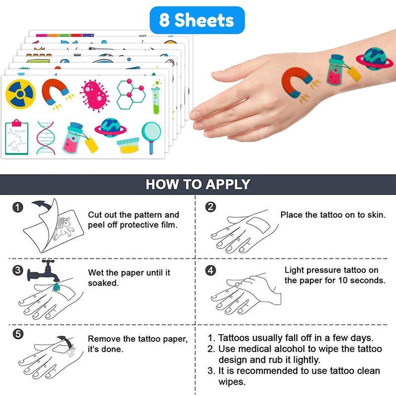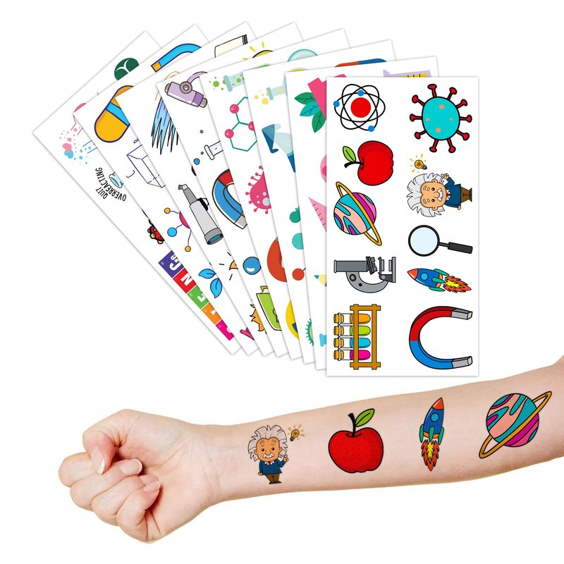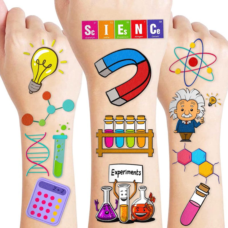 - đ§ȘăIDEAL TATTOOS FOR THEMED SCIENCE DECORă: This set of temporary SCIENCE-themed tattoo stickers comprises 8 sheets in total, featuring a total of 88PCS adorable, distinct designs. They are excellent for distributing as party favors and small gifts with a SCIENCE theme for holidays. Each sheet measures 6.1 * 3.1 inches, making them suitable for kids of all sizes.