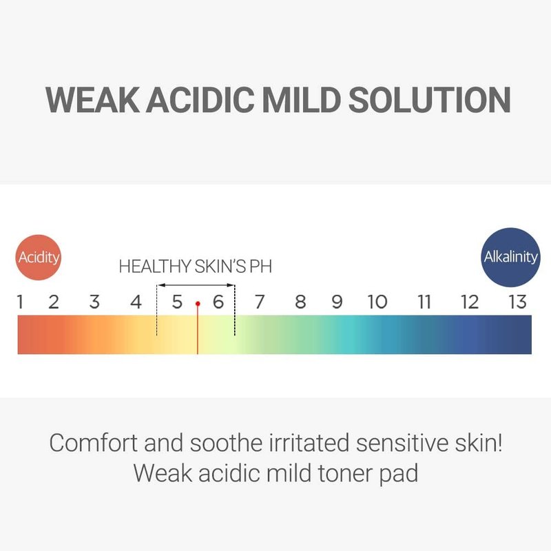 WEAKLY ACIDIC MILD TONER PAD : Contains Madecassoside, Centella Asiatica Extract and Aloe Vera leaf juice to soothe irritated and sensitive skin