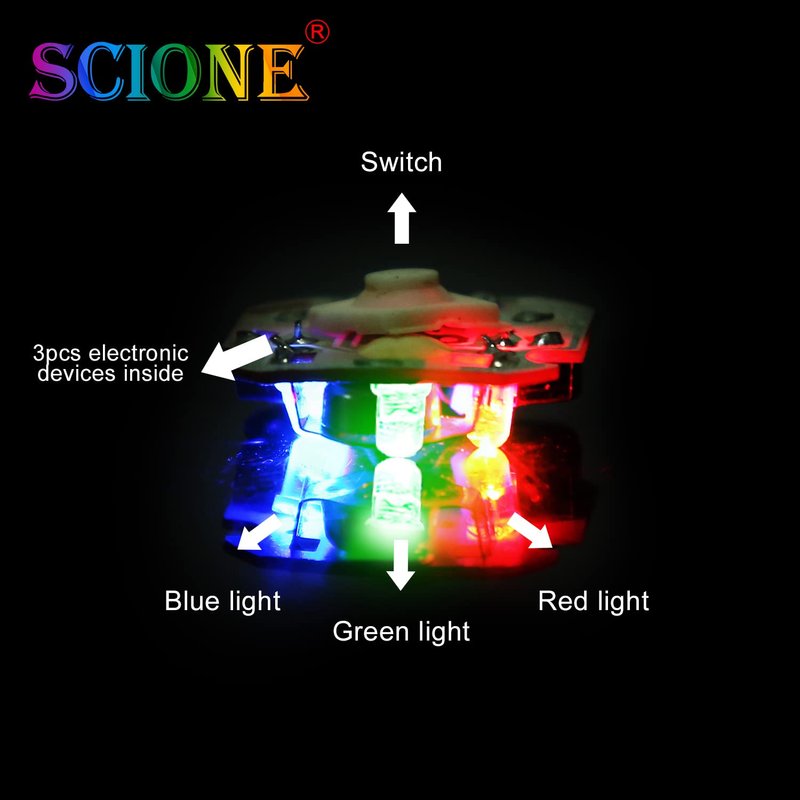 - These goodie bag stuffers have three LED lights - red, blue and green. Three flash modes are also provided. If you press the switch once, the light will blink continuously (the first type of flash). If you press it again, the light will blink very quickly (the second type of flash). If you press it the third time, the three LED lights will first blink in turn and then blink quickly (the third type of flash). If you press it the fourth time, the switch will be turned off.
