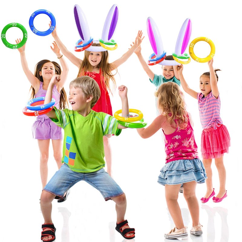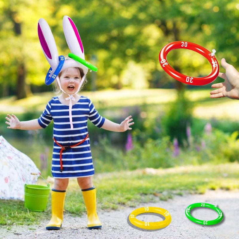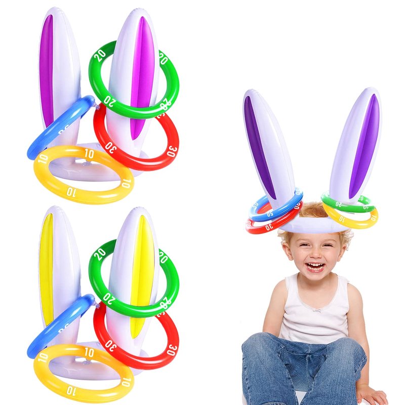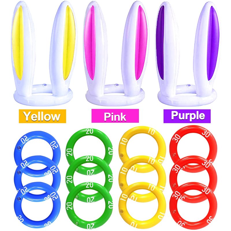 - [ Inflatable Ring Toss Game ]: Package include: 3 x Inflatable Easter Bunny Ear Hats (purple, pink, yellow) + 12 x Inflatable Toss Rings printed with scores (yellow-10 score, green-20, red-30, blue-50). Player with most points wins. Suitable for family intelligence games with kid.