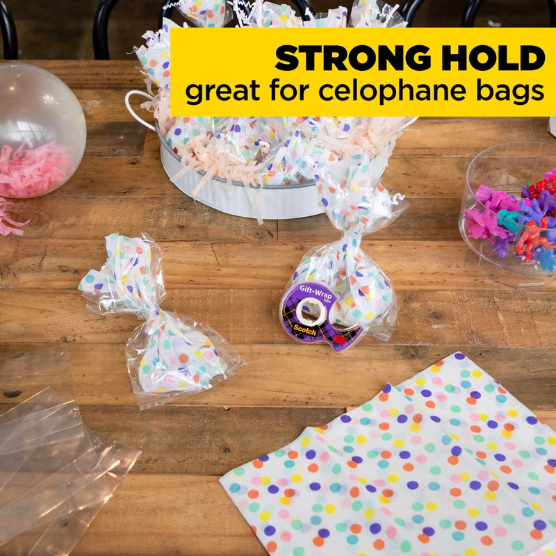 - GIFT TAPE WITH A SECURE, STRONG HOLD: 6 rolls of Scotch Gift Wrap Tape with a tape dispenser gives a strong, secure hold to seal gift bags and keeps presents securely wrapped