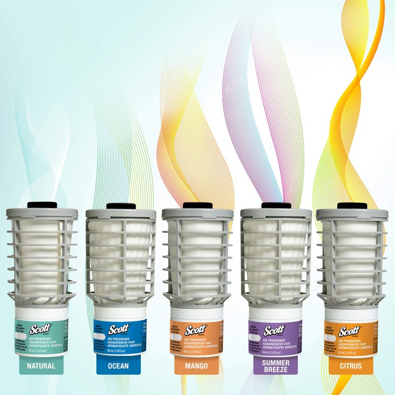 - The Scott Essential Air Freshener Refill from Kimberly-Clark (6 cartridges per case), in fresh Mango Scent, offers an economical, effective odor neutralizer, designed to work with an easy-to-use wall mounted dispenser