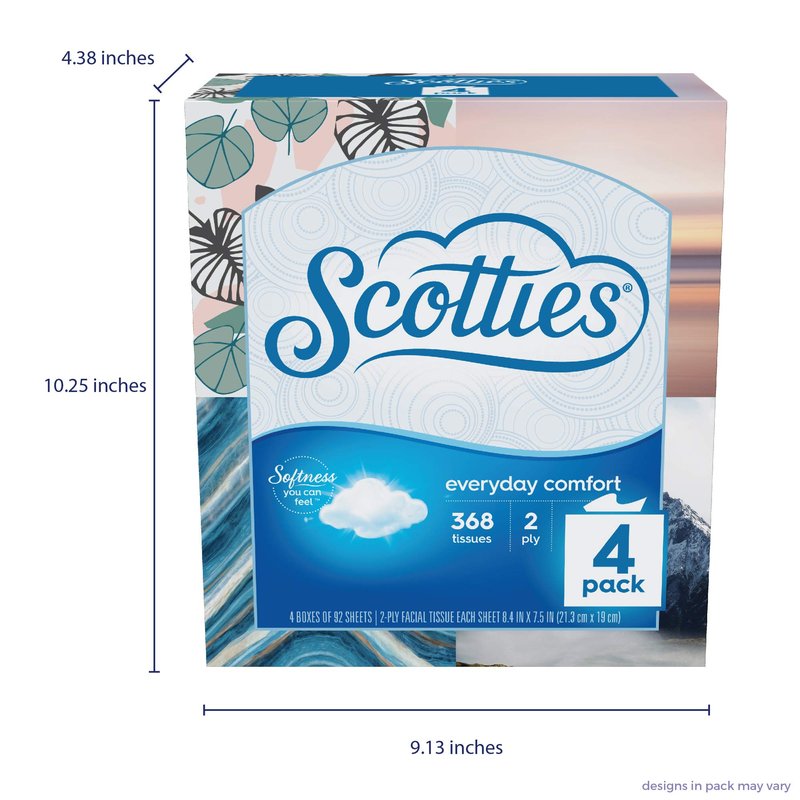 - Value: Scotties Everyday Comfort Facial tissues offers great value with 4 cube boxes per pack having 92 tissues each, delivering 368 tissue sheets in total