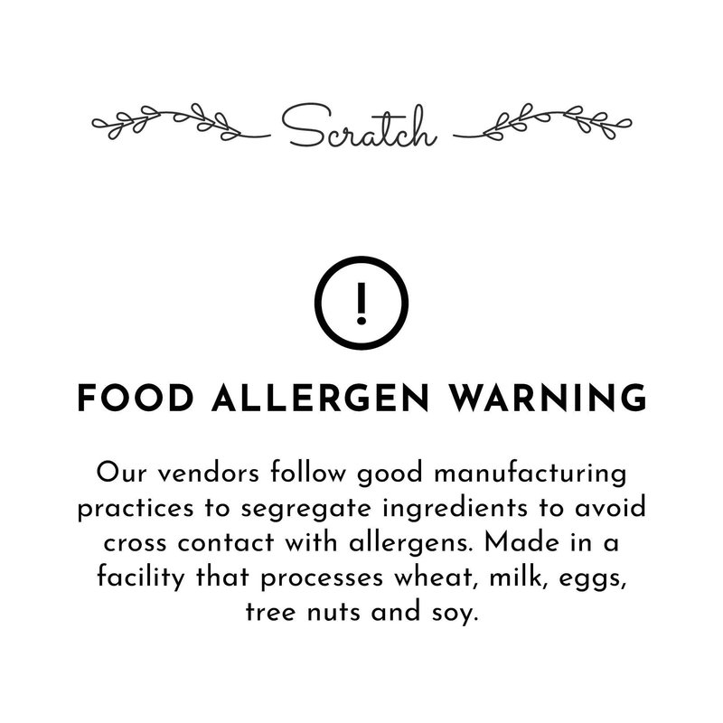 - Satisfaction Guaranteed: Scratch ingredients are sourced and manufactured with the highest quality standards. All of our products are backed by our 100% customer satisfaction guarantee. Our vendors follow good manufacturing practices to segregate ingredients to avoid cross contact with allergens. Made in a facility that processes wheat, milk, eggs, tree nuts and soy.