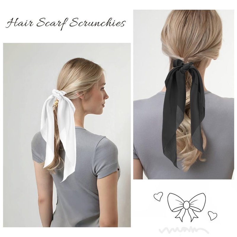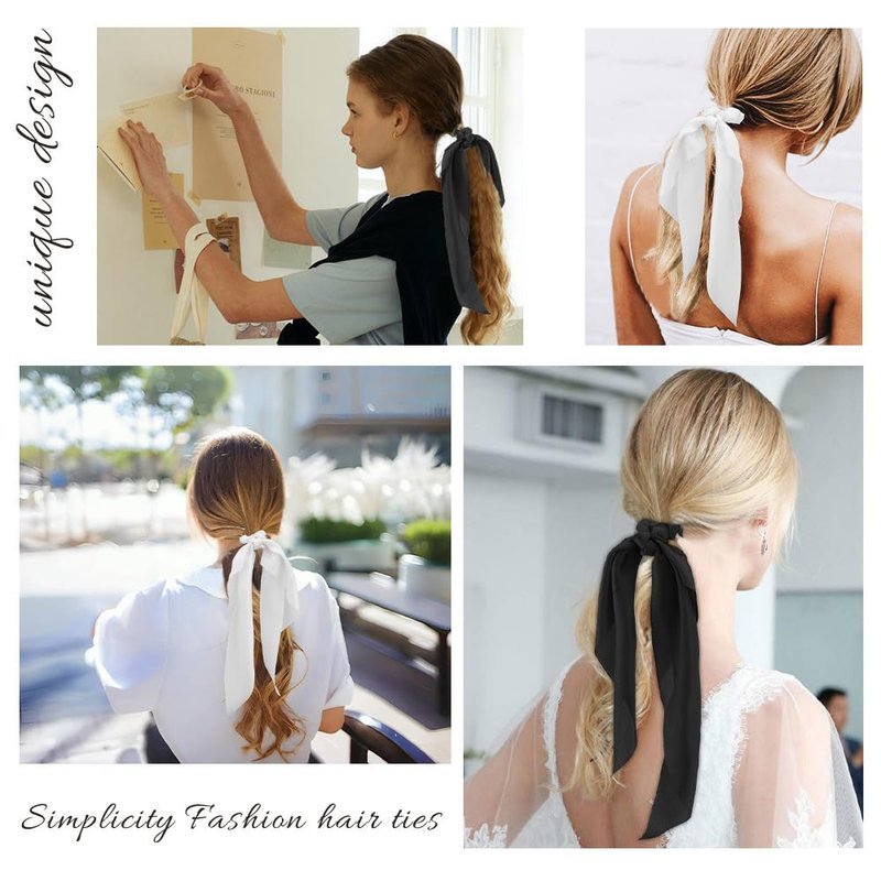 - Bow Scrunchies: There are 2 satin hair bows in the package. Hair ties are made of high quality silk material. The silk scrunchies looks shiny and textured. Smooth and soft to the touch. Scrunchies ponytail holders very stretchy and allows hair to be put in and out easily. Hair scrunchies won't leave scrunchie marks on your hair or damage your hair. Easy and comfortable to wear.