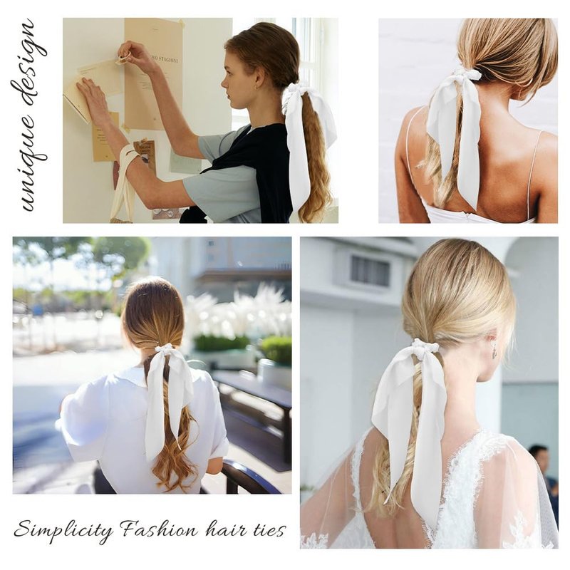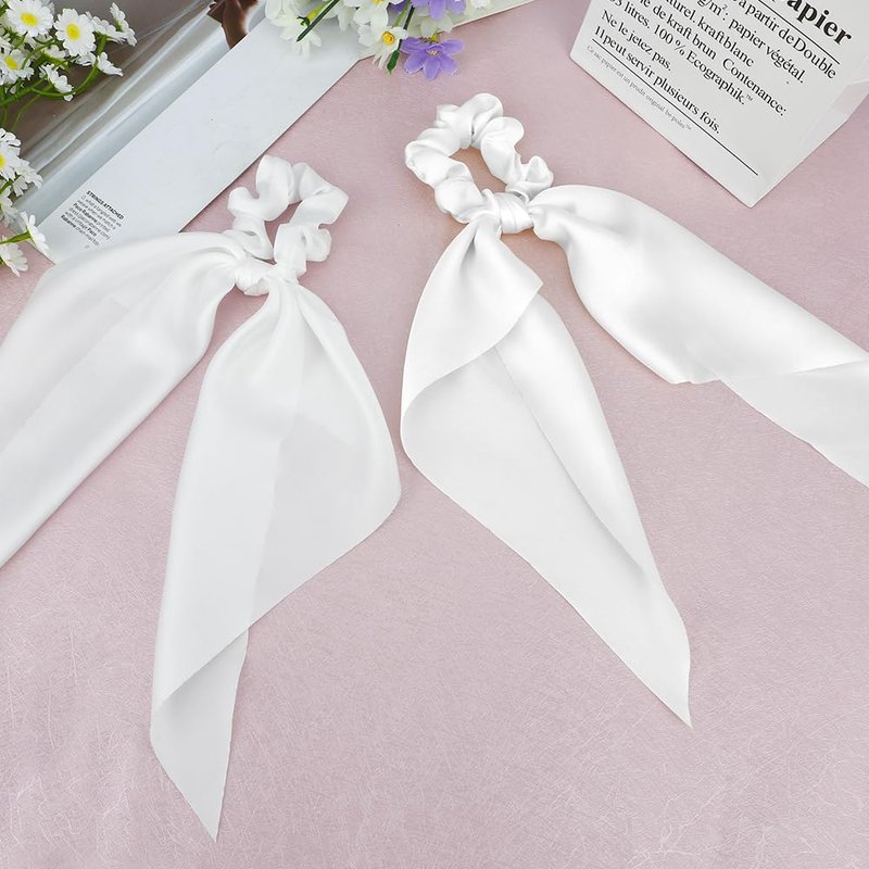 - Bow Scrunchies: There are 2 satin hair bows in the package. Hair ties are made of high quality silk material. The silk scrunchies looks shiny and textured. Smooth and soft to the touch. Scrunchies ponytail holders very stretchy and allows hair to be put in and out easily. Hair scrunchies won't leave scrunchie marks on your hair or damage your hair. Easy and comfortable to wear.