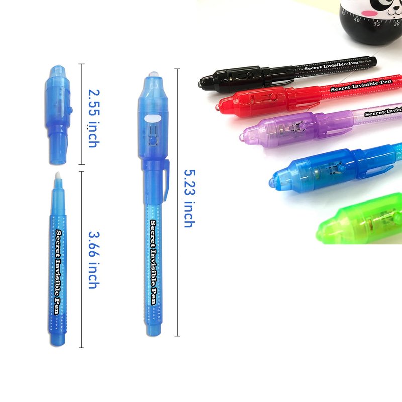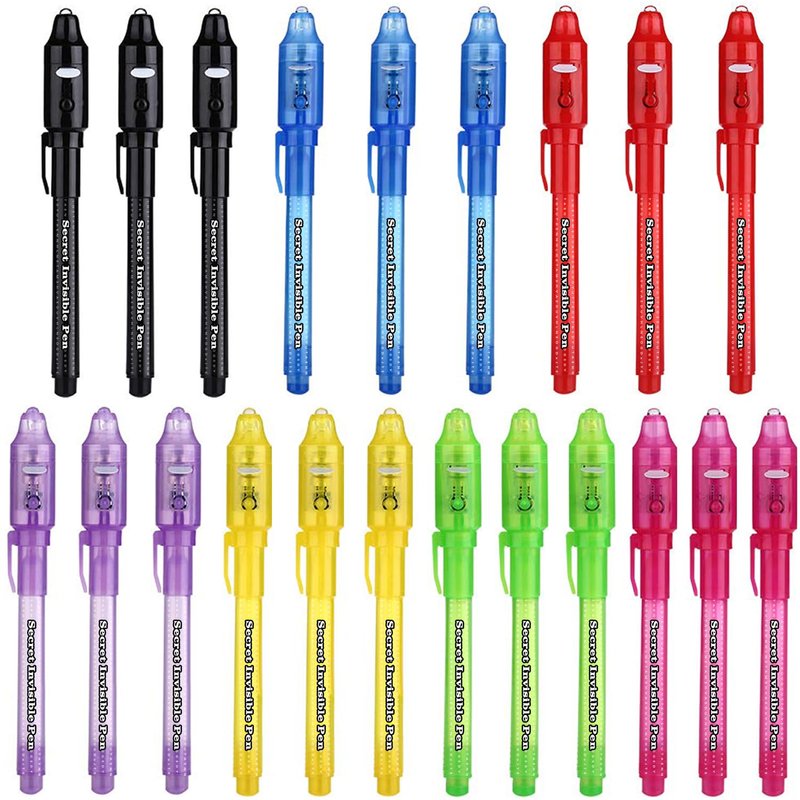 - Invisible Ink Pens with UV Light: Harmless and tasteless ink, healthy toy for your kids! Smooth and colorful disappearing inks on t-shirts, paper! Permanent but washable! you can easily host a kid's birthday party favors stocking stuffer, treasure hunt,escape room,Valentines Day Gifts or classroom activity complete with invisible ink clues