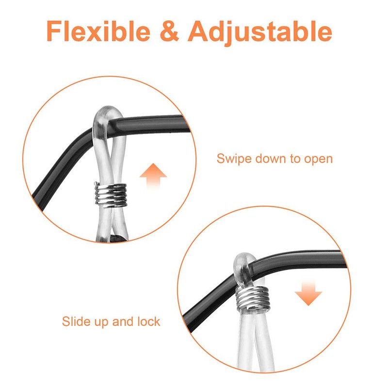 - ADJUSTABLE RUBBER ANTI-SKID BUCKLE: The high-elastic silicone rubber anti-skid buckle at both ends of the eyeglass chain is firmly wrapped around the temple and is not easy to fall off. Eyewear retainer is flexible and adjustable, it can be used for all types of glasses, such as sunglasses, swimming goggles, sports glasses, reading glasses, etc.