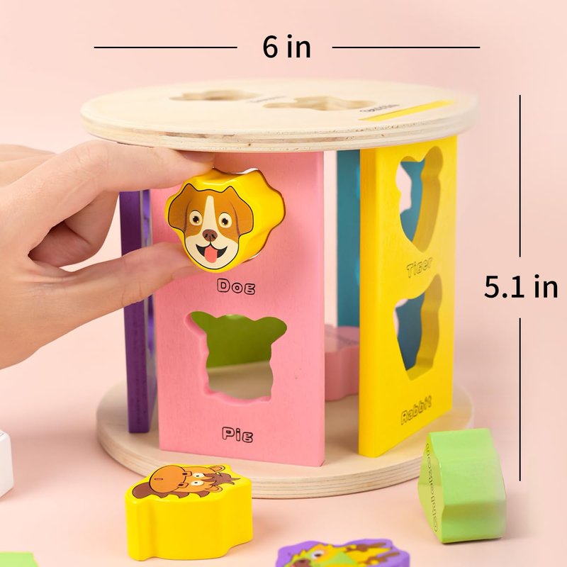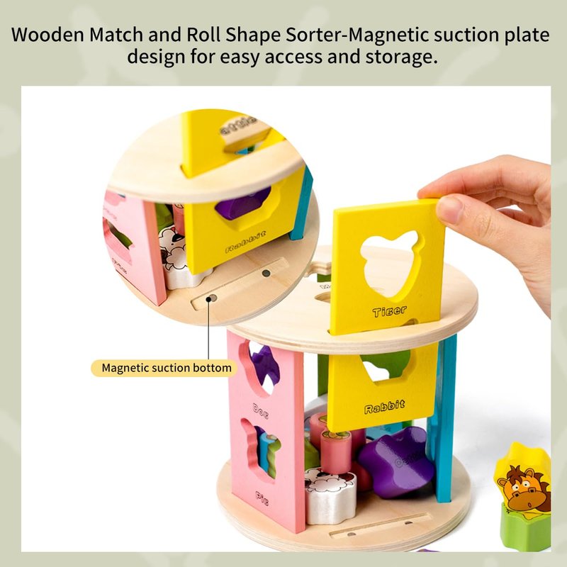- 【 🐏 Animal Pattern Shape Sorting Toy】: Wooden Match Roll Shape Sorting for 3 years and up, a wooden shape sorting toy with various shape sorting holes. Encourage children to recognize shapes by identifying corresponding animal patterns and placing them in the correct holes, improve their ability to recognize animal images and colors, and organize and coordinate their eyes and hands