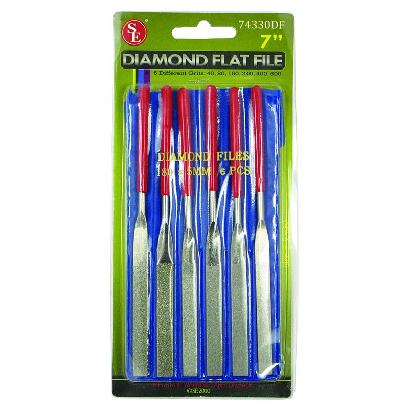 SE 74330DF 6-Piece Flat Diamond Grit File Set - Multi-Grit for Metals, Glass, Stones - 7" Length, 2" Diamond Surface, Round Handles - Includes PVC Pouch