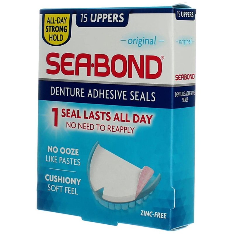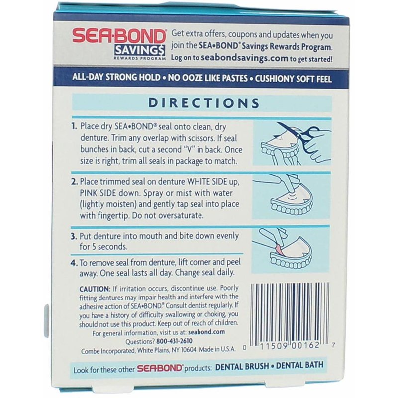 Product Description Get the extra confidence you’re looking for. Sea Bond Denture Adhesive works differently. The cushiony, soft seal gives you all day hold without the ooze and mess of denture pastes. And it’s zinc-free. Now you can wear your dentures comfortably all day and still feel like yourself.Secure denture adhesive for a stronger all day comfortable holdOoze free, unlike denture pastes or denture creamsEasy, no-mess cleanupCushiony, soft feelZinc-free Instructions Place dry Sea Bond wafer on denture. If too large, trim overlapping wafer with scissors. If upper wafer bunches up in back, cut a V in the back like the pre-cut V in frontClean Denture thoroughly. Moisten wafer with warm waterPosition moistened wafer with white side up. Smooth wrinkles with fingerPlace dentures into mouth. Hold firmly until secure. If wafer does not hold, moisten wafer more thoroughlyTo remove wafer from denture, lift corner and peel away. Change wafer daily Warnings Safety Warning: If irritation occurs, discontinue use. Poorly fitting dentures may impair your health and will interfere with the adhesive action of SeaBond. Consult dentist regularly. If you have a history of difficulty swallowing or of choking, you should not use this product. Keep out of reach of children.