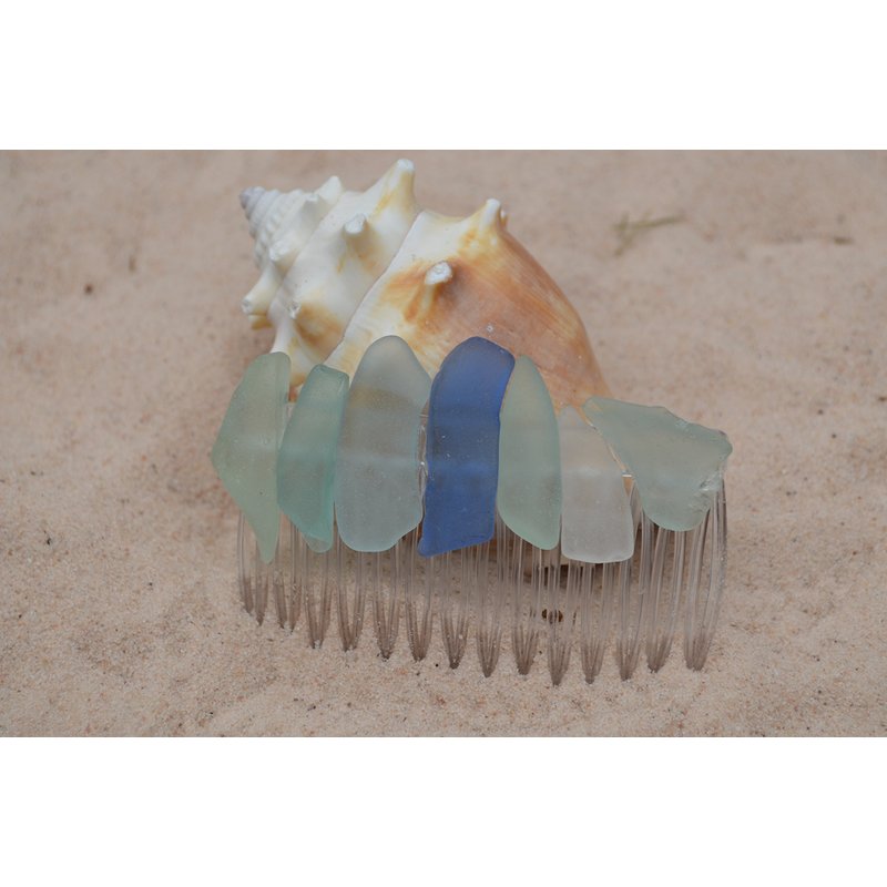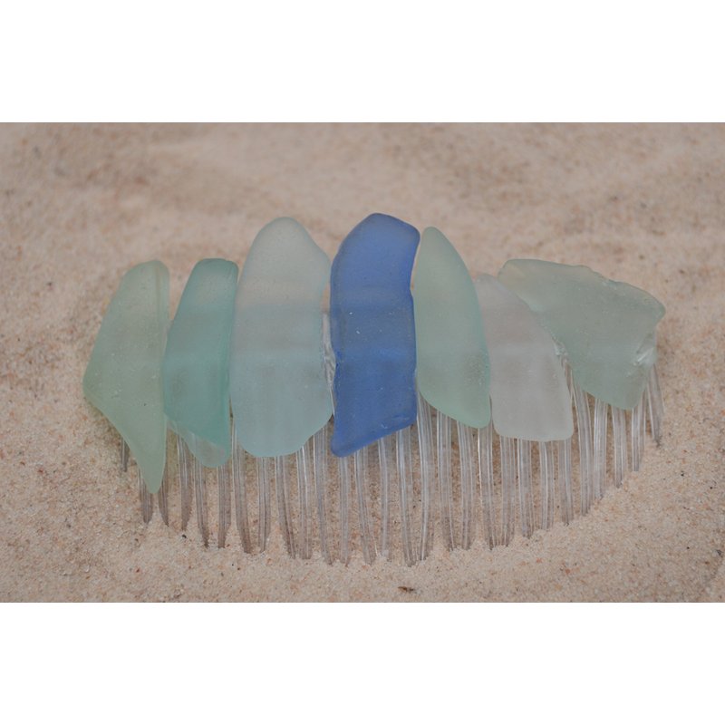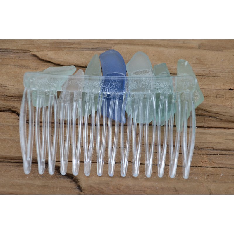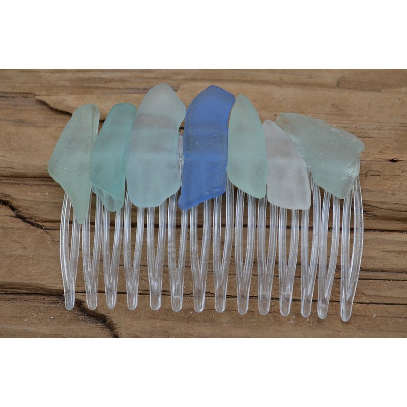Lovely aqua, cornflower blue and frosted sea foam sea glass hair comb. The lightly colored frosted beach glass adorns an acrylic hair comb. The hair comb is perfect for a beach wedding or just frolicking in the surf while enjoying a day at the beach. The hair comb is handmade. Each piece of sea glass was carefully selected for its unique and compelling ocean shades and shapes, combined the pieces of sea glass create a lovely hair comb. The sea glass is genuine and was collected on the rocky shores and sandy beaches of Casco Bay, Maine. The sea glass has a lovely natural frosted surface as a result of the glass being tossed about the ocean waves and sandy shores for a number of years. The hair comb is made in the USA and comes from a smoke free environment. The hair combs measure: 67 mm x 41 mm or 2.65 inches x 1.6 inches