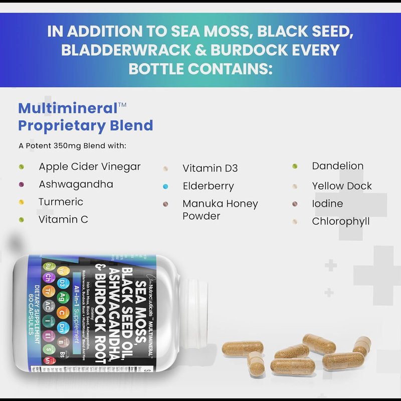 - Introducing the MultiMineral Blend - Sea Moss Pills, Black Seed Oil Pills, Ashwagandha Root, Bladderwrack Capsules and Burdock Root Capsules that contain 10+ powerhouse ingredients, turmeric curcumin capsules, Apple Cider Vinegar, Chlorophyll, Manuka Honey, and more! These sea moss bladderwrack burdock root capsules are alternatives to sea moss gummies, black seed oil gummies, and ashwagandha gummies for men. Not usual sea moss raw organic, wildcrafted sea moss gel or ashwagandha supplements.