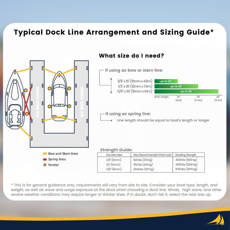 (The above is a general guideline only. Consider your boat type, length and weight, as well as surge exposure when choosing a dock line. Weather conditions may require heavier lines. Do not exceed the recommended maximum workload)