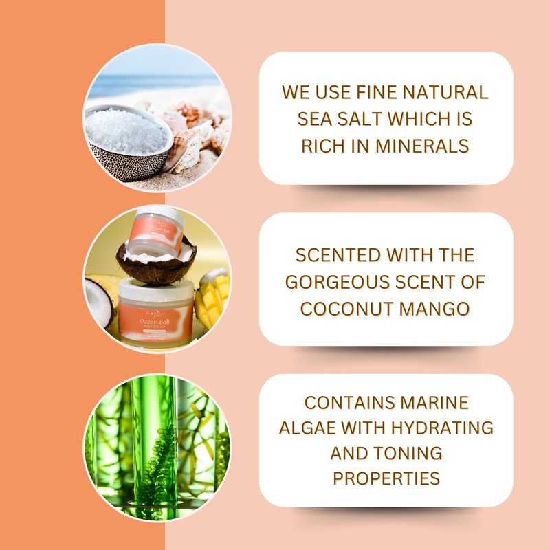 - NATURAL SEA SALT & MARINE ALGAE: Enriched with natural sea salt and marine algae oil, our unique formulation goes beyond exfoliation. The sea salt and marine algae contribute to improved hydration and overall skin condition. Users have reported anti-aging benefits, including a reduction in wrinkle depth, a more unified skin tone, and enhanced skin elasticity. Packed with essential nutrients, this salt scrub not only exfoliates but also moisturizes and nourishes your skin.