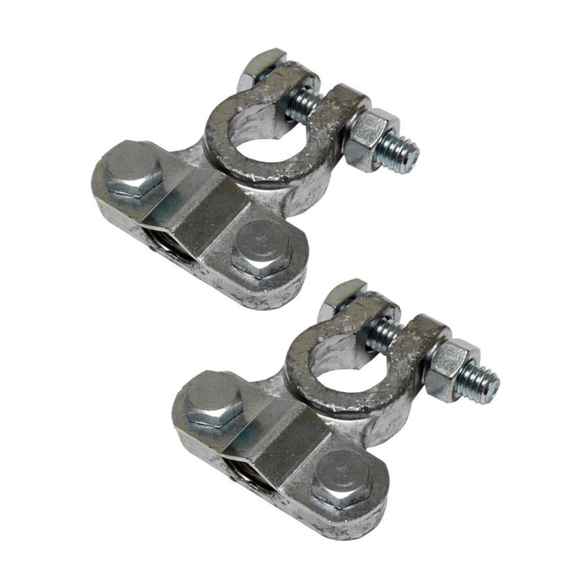 Made from 100% recycled lead. Universal style fits positive or negative posts. Clamp holds cable or strap. Removable plate for easy assembly. Threaded clamp avoids wire pull out. For use with 6 thru 1 AWG wire . Priced per pack of 2