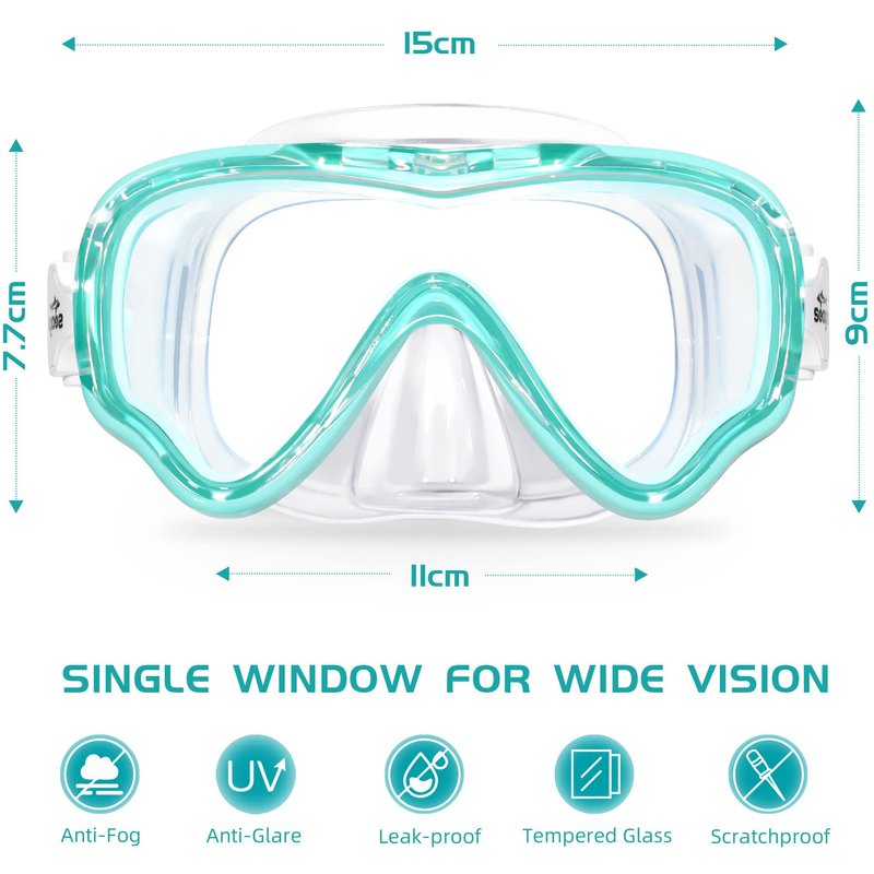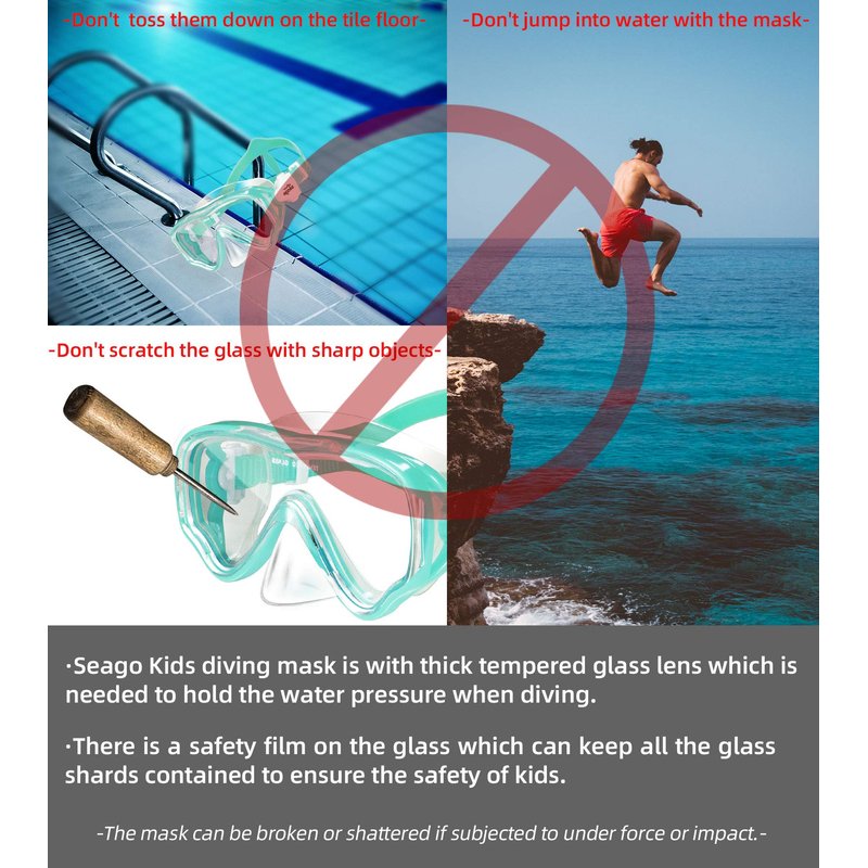- 🐋【Tempered-Glass Lens for Safety】Seago swim mask chooses the ultra clear thickened tempered glass with a safety film to withstand deep water pressure for all types of diving or swimming. Scratching resist lens provides the clearer view under water.Seago kids diving mask is with thick tempered glass lens, but please Don't toss them down on the tile floor, Don't jump into water with the mask, Don't scratch the glass with sharp objects.