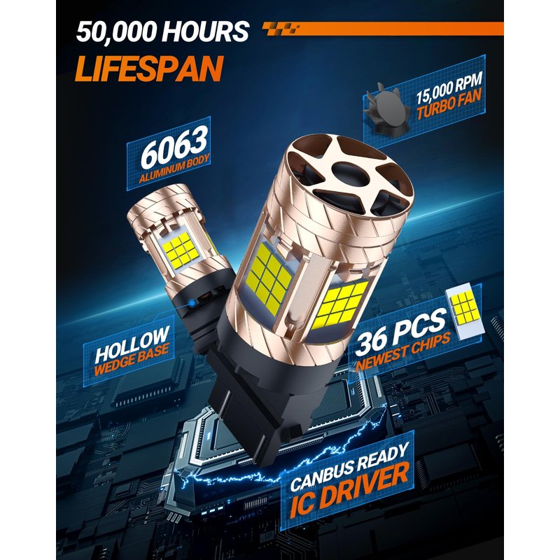 【 1500% Increase Brightness 】The 3157 3156 LED bulb has a brightness of 30 watts and 3200LM, with 6000K super white light, which means that even in foggy and other adverse weather conditions, other vehicles can clearly see your light signal.